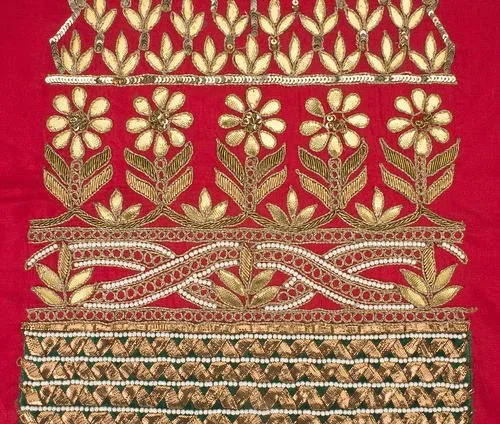 This embroidery consists of two distinct types: Gota and Patti. It employs a unique technique involving small metallic ribbons (Gota).